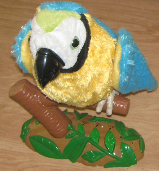 It can store up to 31 different samples, and play them back randomly when the microphone picks up enough noise. My dog hates it, and when she barks at it, it will start its random playback of various sounds that I have recorded into it. For example “ruff ruff ruff!!!” It also flaps its wings and moves its beak as it talks back. It totally rocks when you get it beat boxing.