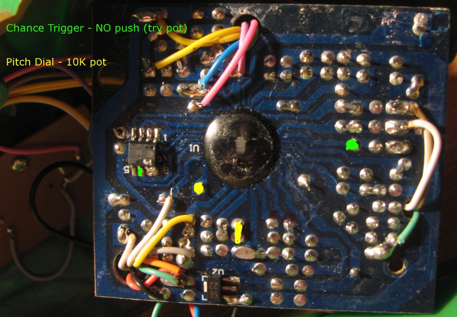 The pitch dial makes a darth vader style playback. The chance trigger seems to make a glitchy high pitched loopy sound. I put it back together because I got a speak and read, and wanted to work on that. So I will be tearing into this one soon. I will post sounds and pics as soon as she is all bent up.